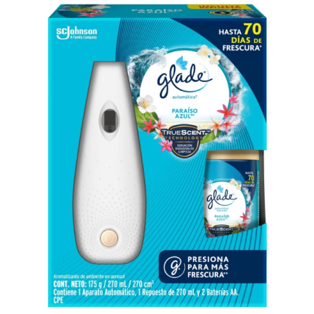 7501032909406 AMBIENTADOR GLADE APARATO + REPUESTO PARAISO AZUL 270 ML AUTOMATICO 323181